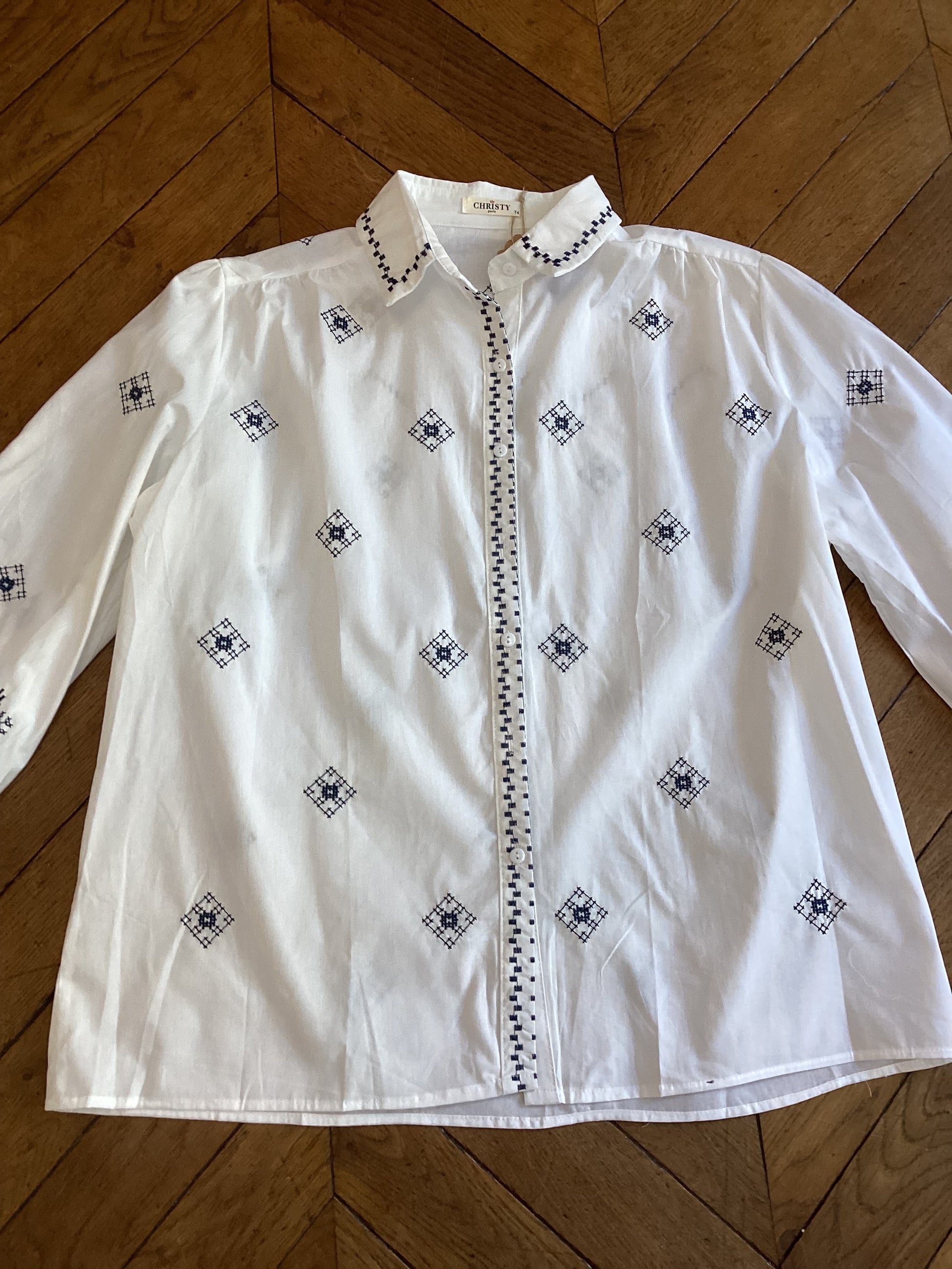 Cette chemise blanche au charme intemporel est rehaussée de délicates broderies bleu marine qui lui donnent une touche bohème et élégante à la fois.
