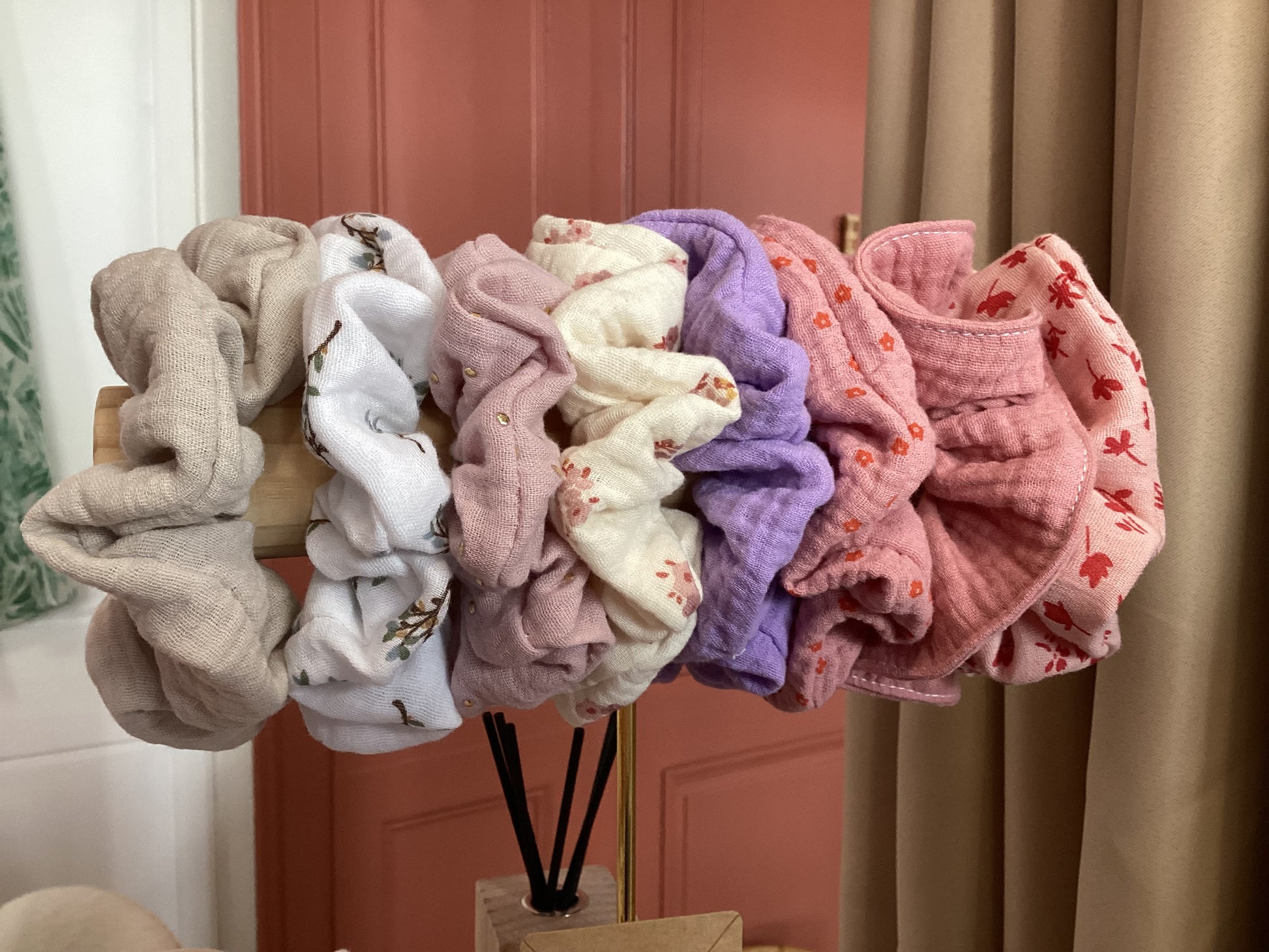 Apportez une touche de couleur et de légèreté à vos coiffures avec nos chouchous en double gaze.