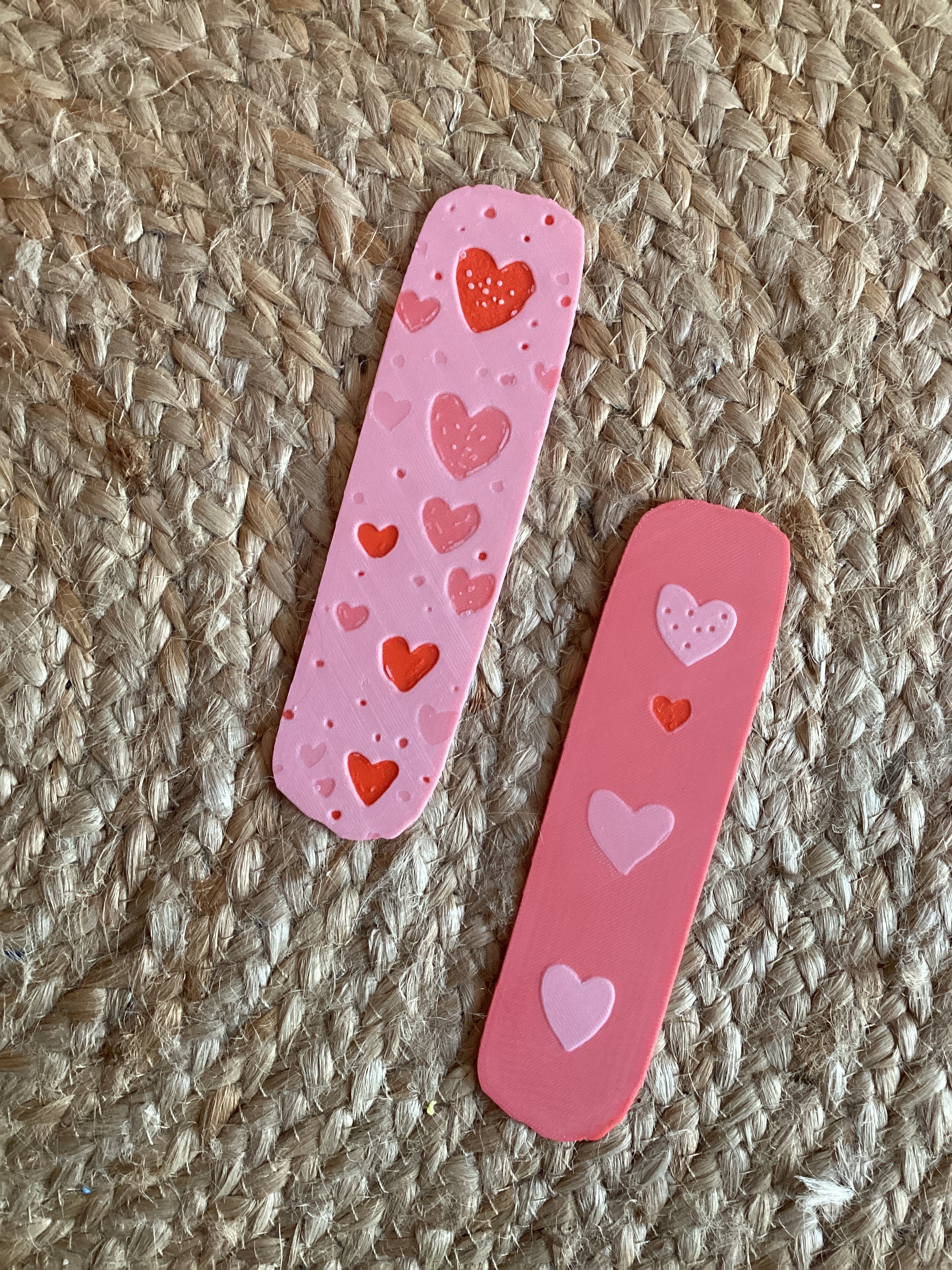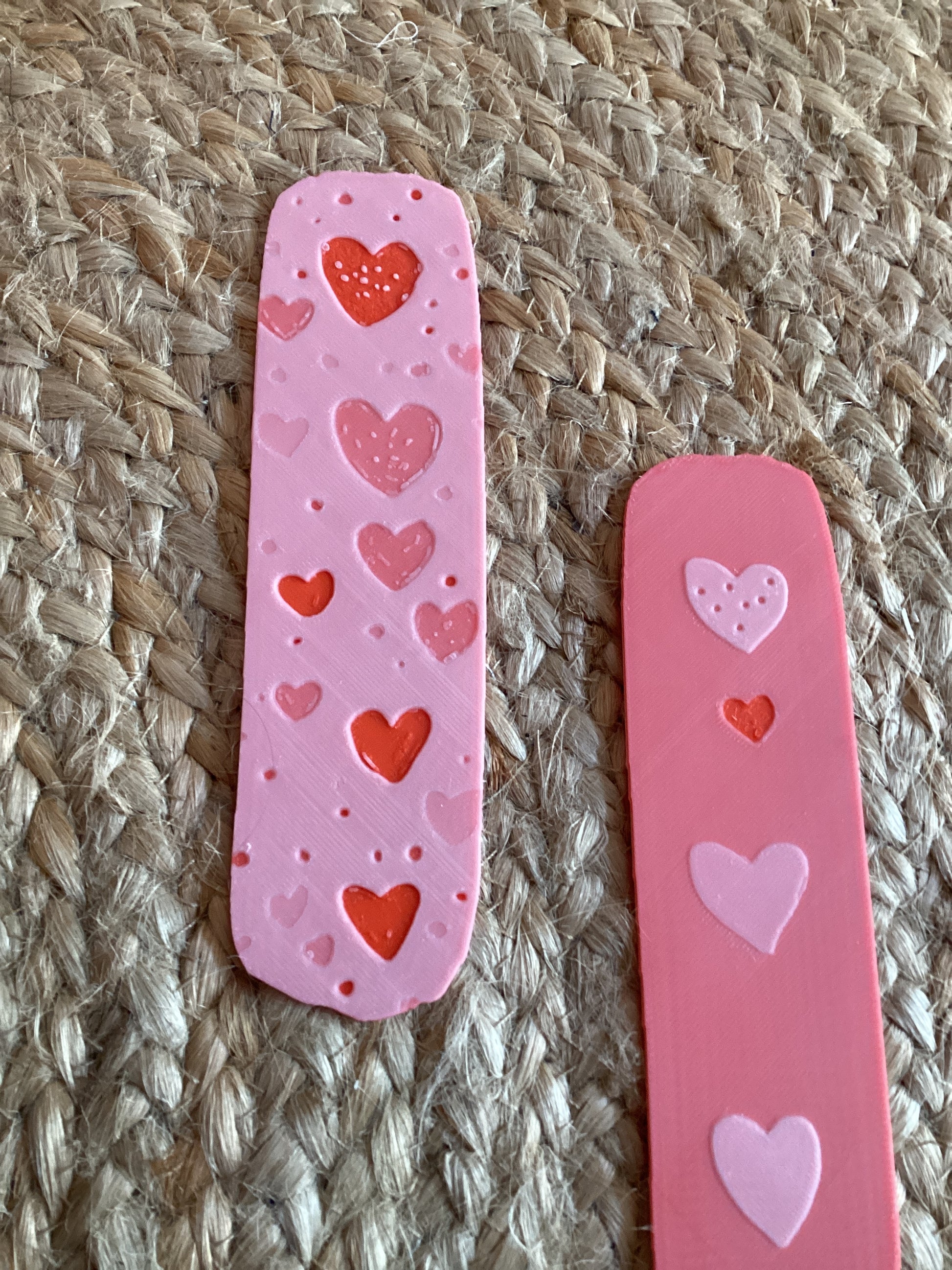 De jolis marque-pages roses avec des cœurs, réalisés en impression 3D, au prix de 6 € l’unité.
