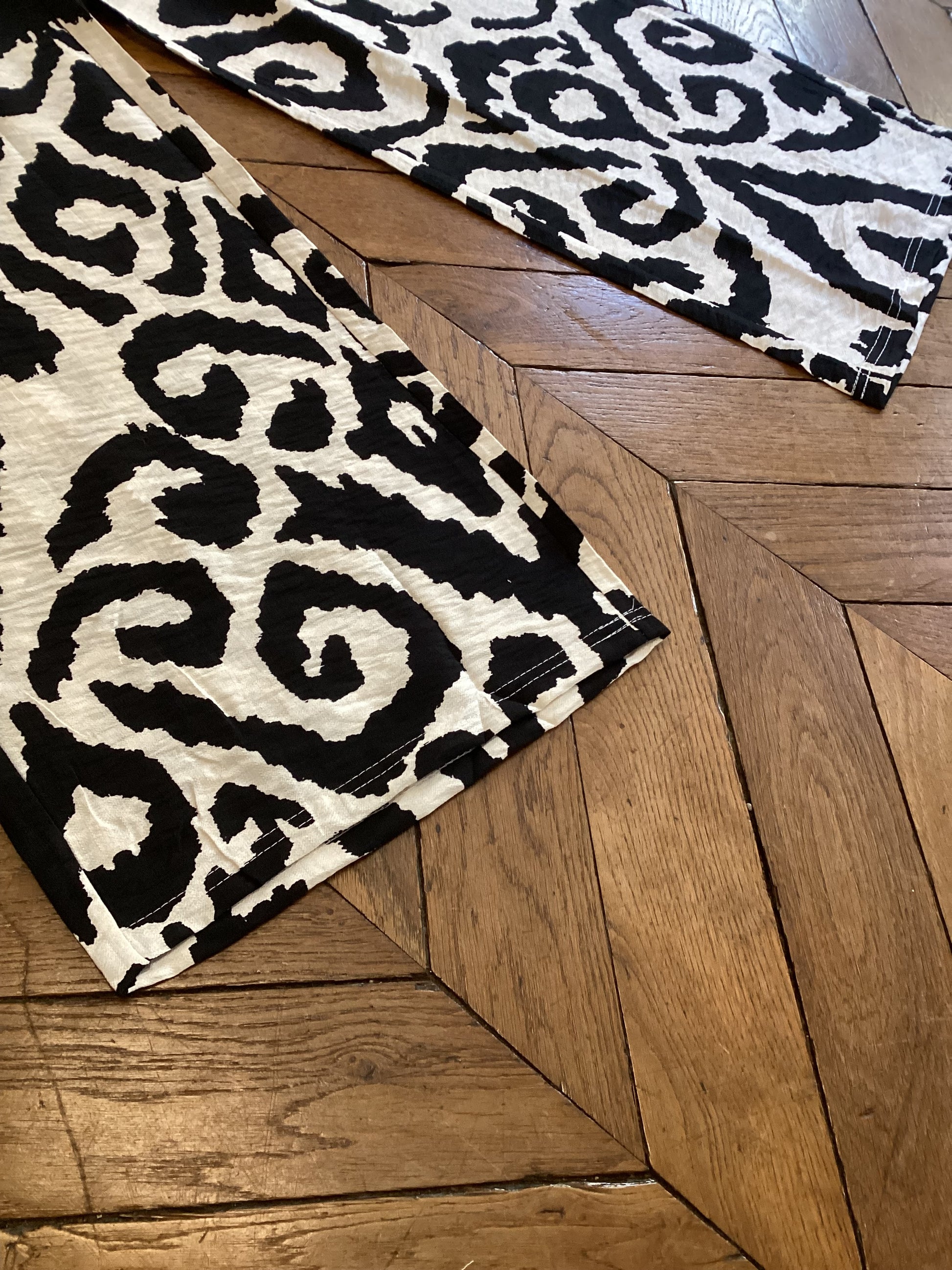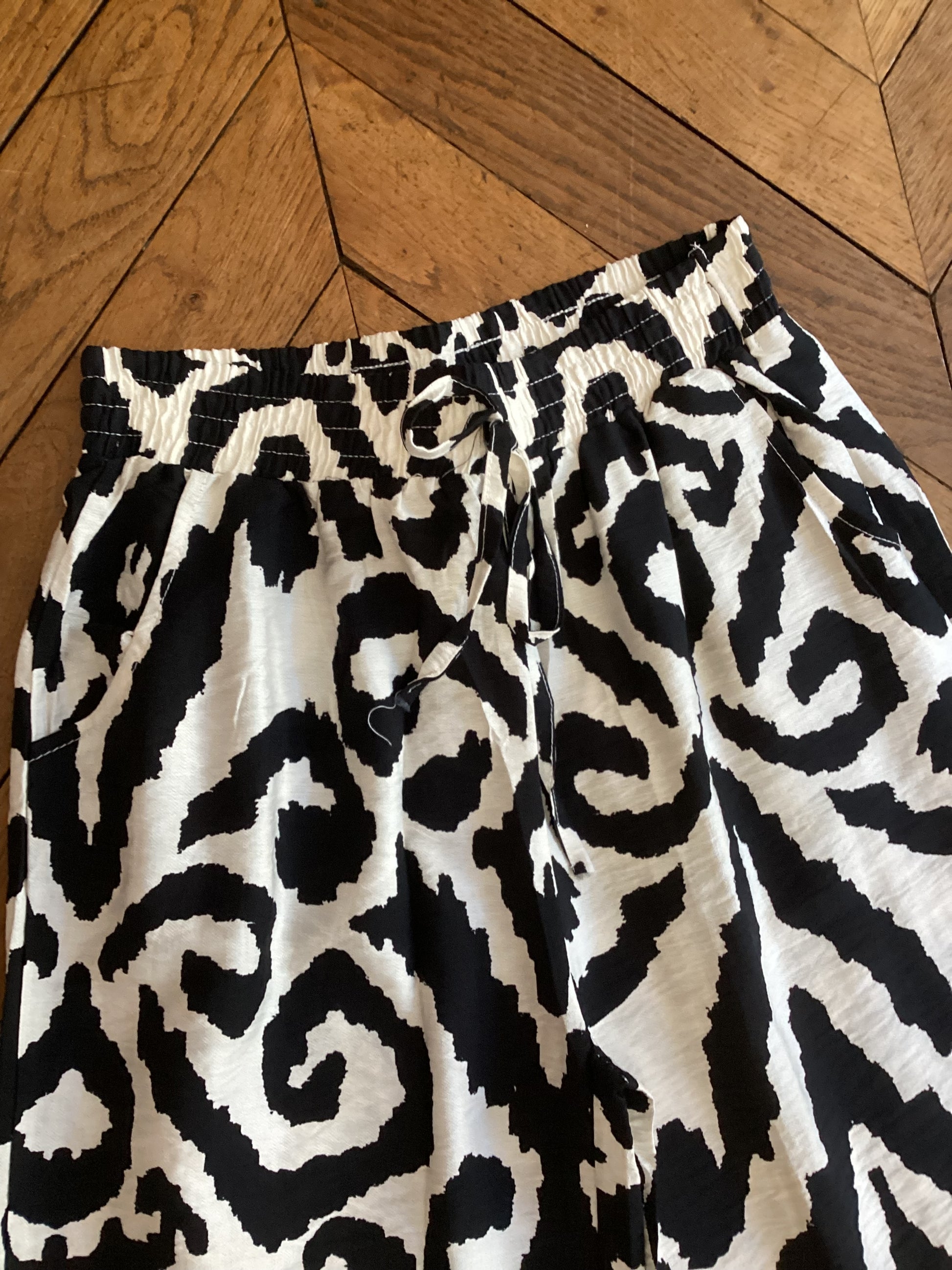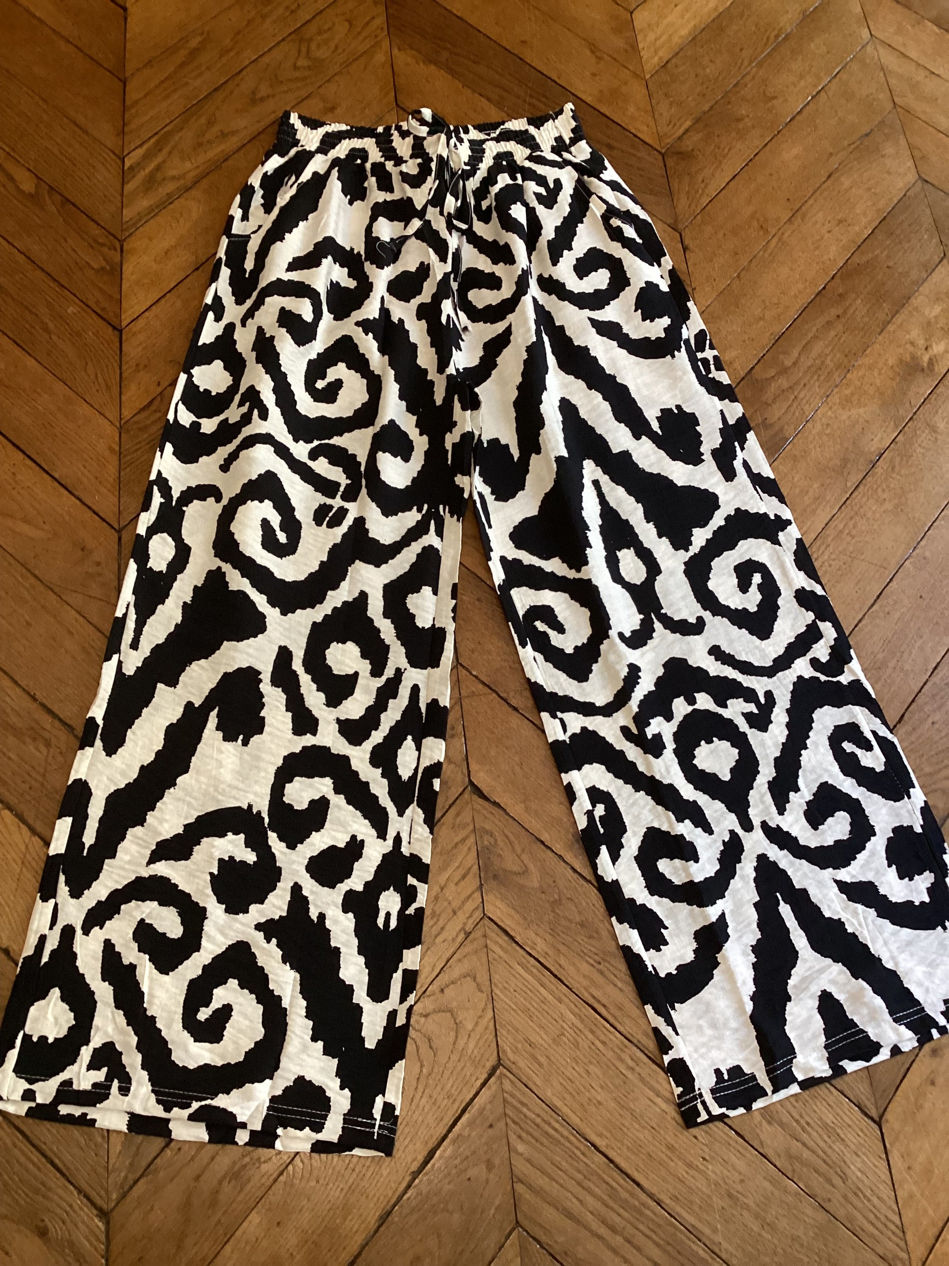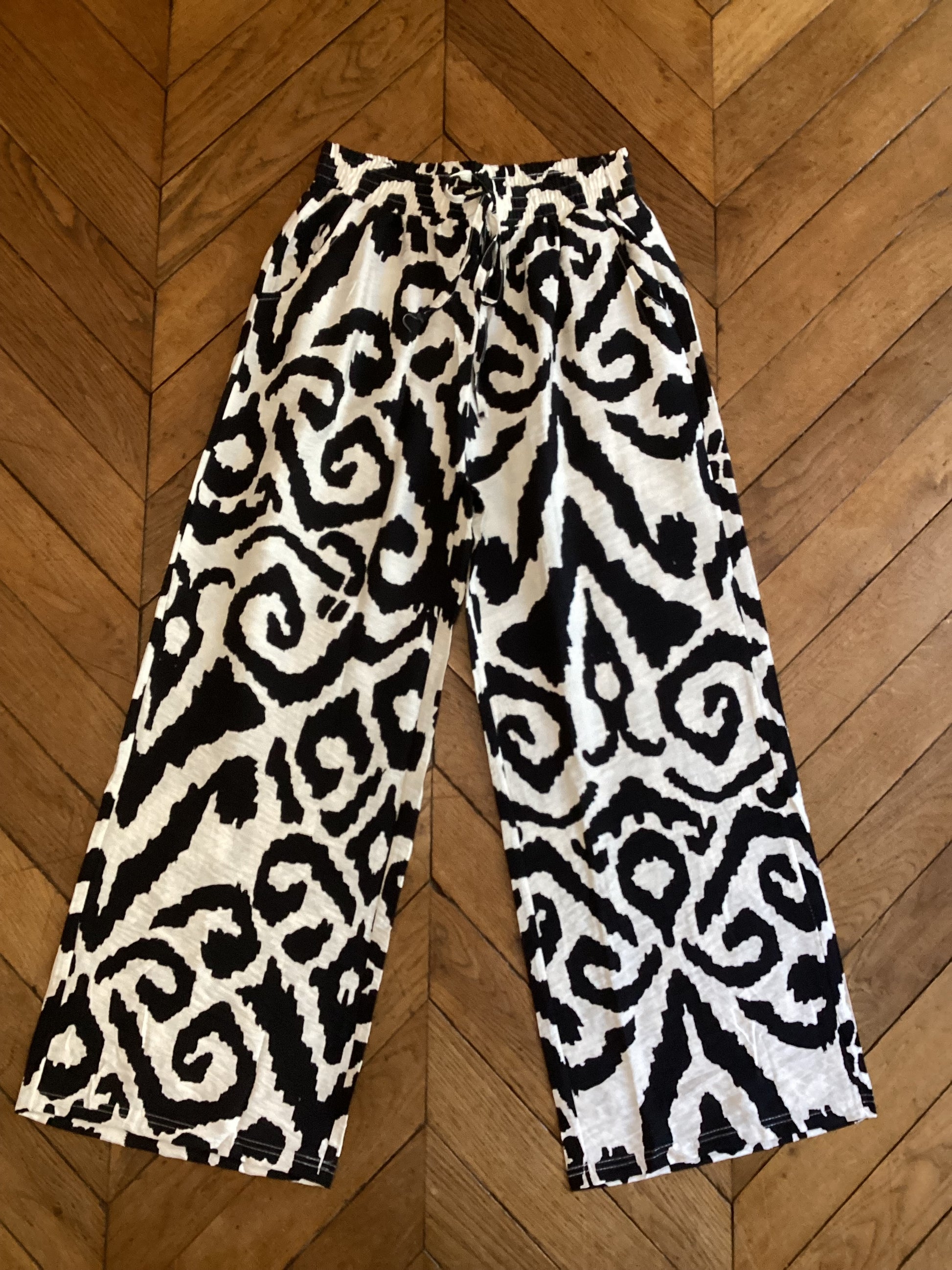 Avec sa coupe fluide et confortable, ce pantalon se distingue par son imprimé audacieux en noir et blanc aux accents graphiques et artistiques. Taille élastique avec lien de serrage pour un ajustement parfait, jambes larges pour une liberté de mouvement et un style résolument tendance. Parfait pour apporter une touche originale à vos looks, il se porte aussi bien avec un simple t-shirt qu’avec une blouse élégante.