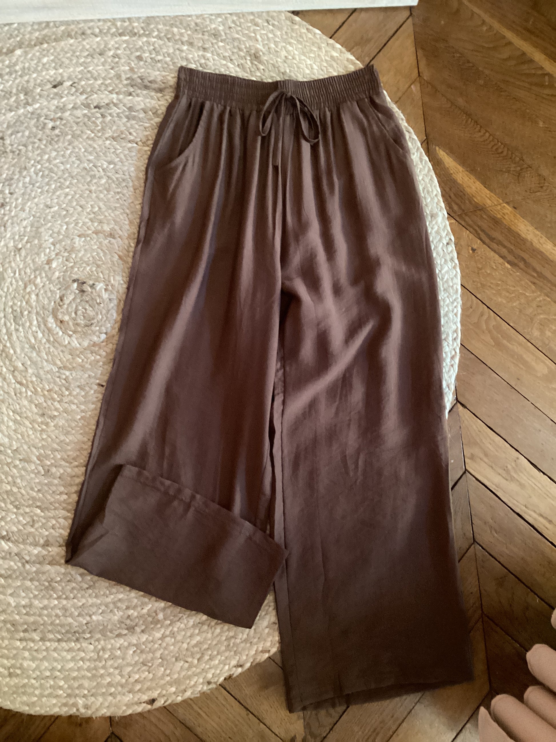 Confort et élégance naturelle avec ce pantalon fluide marron, confectionné dans un coton gaufré doux et léger. Sa coupe ample et sa taille élastiquée à cordon offrent une aisance parfaite tout au long de la journée.