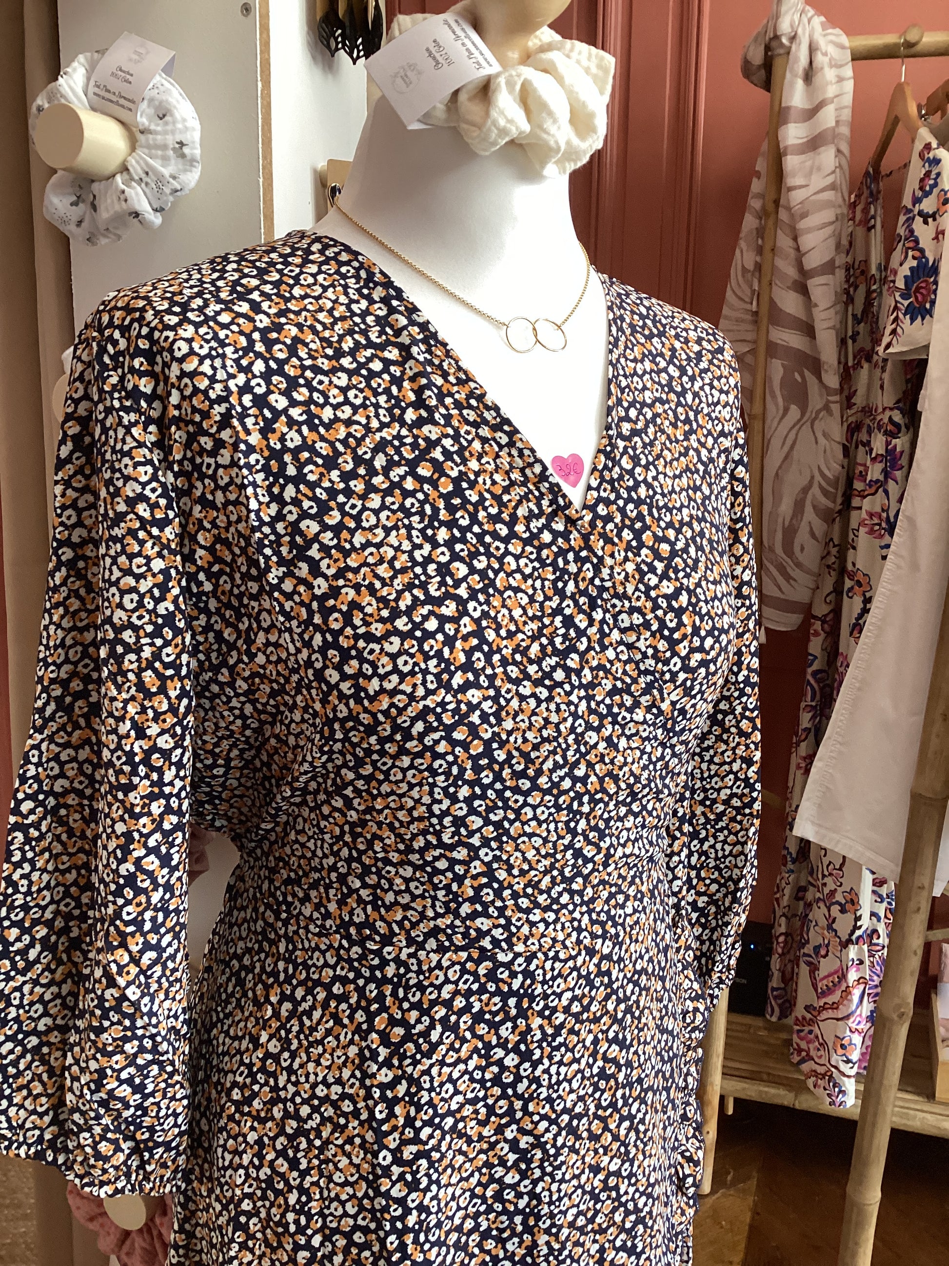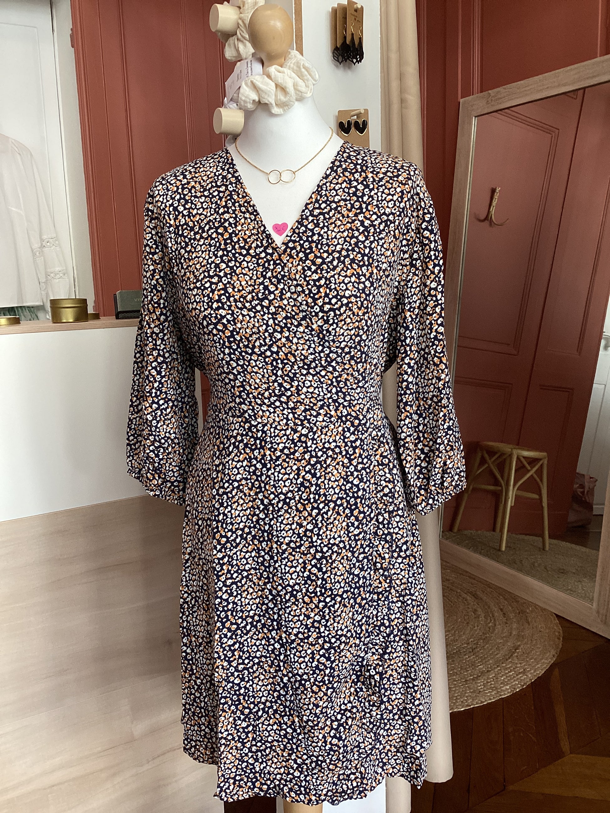 Cette robe portefeuille légère séduit par son imprimé fleuri délicat dans des tons bleu marine, beige et ocre. Son col en V flatteur et ses manches 3/4 légèrement bouffantes apportent une touche féminine et élégante. Idéale pour une journée au bureau comme pour une sortie décontractée, elle se porte facilement avec des sandales ou des bottines. Confectionnée dans un tissu fluide pour un confort optimal et une coupe qui met en valeur toutes les silhouettes.