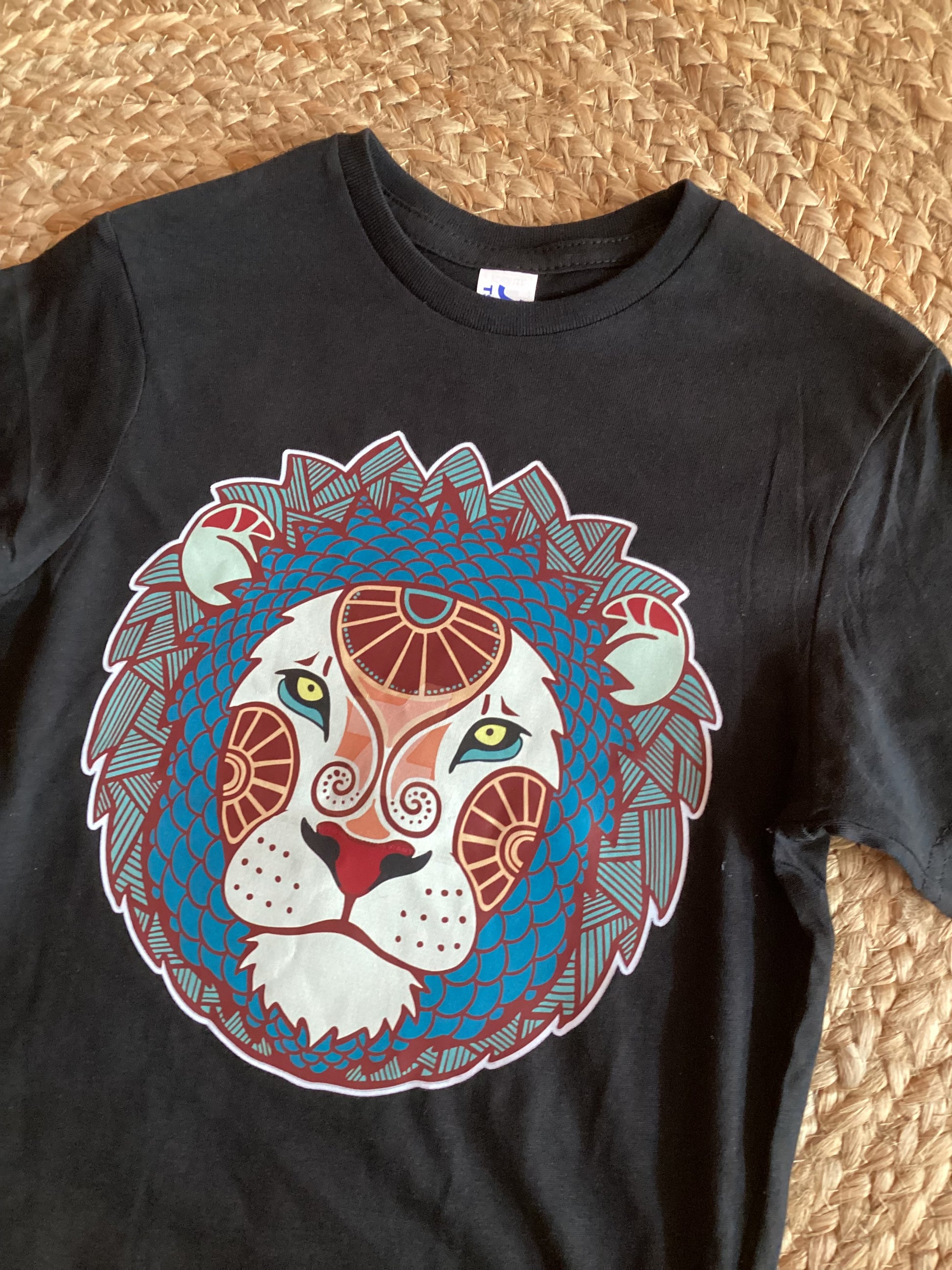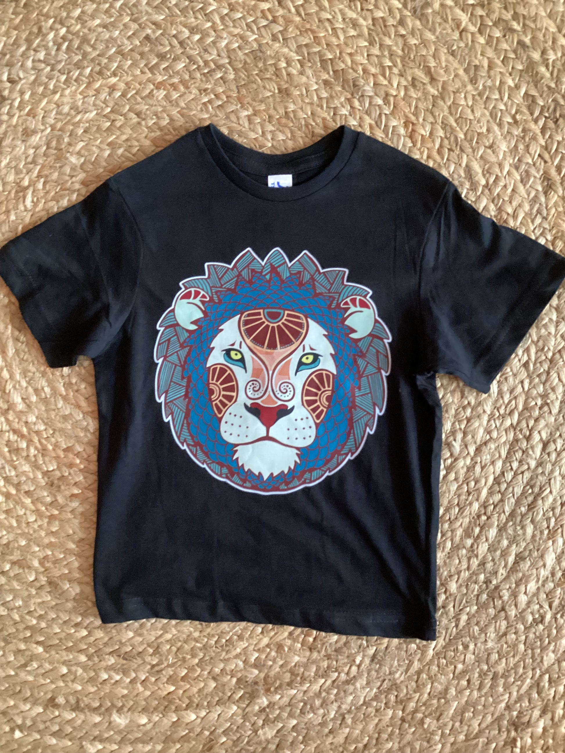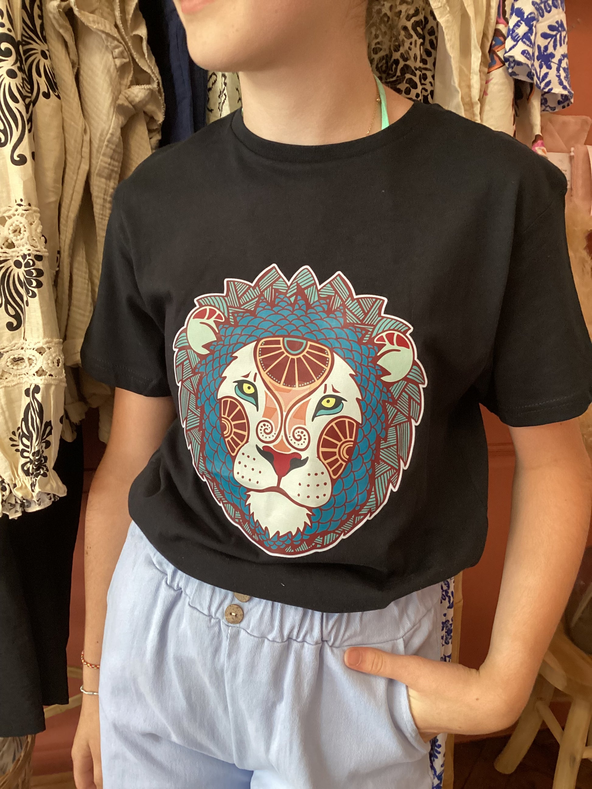 T-shirt noir à manches courtes pour fille, décoré d’un majestueux motif de lion stylisé façon mandala. L’illustration détaillée associe des tons rouges, bleus et gris pour un rendu artistique et puissant. Fabriqué en coton doux, ce t-shirt allie confort et originalité pour un look affirmé et tendance. Parfait pour les petites aventurières au style unique !