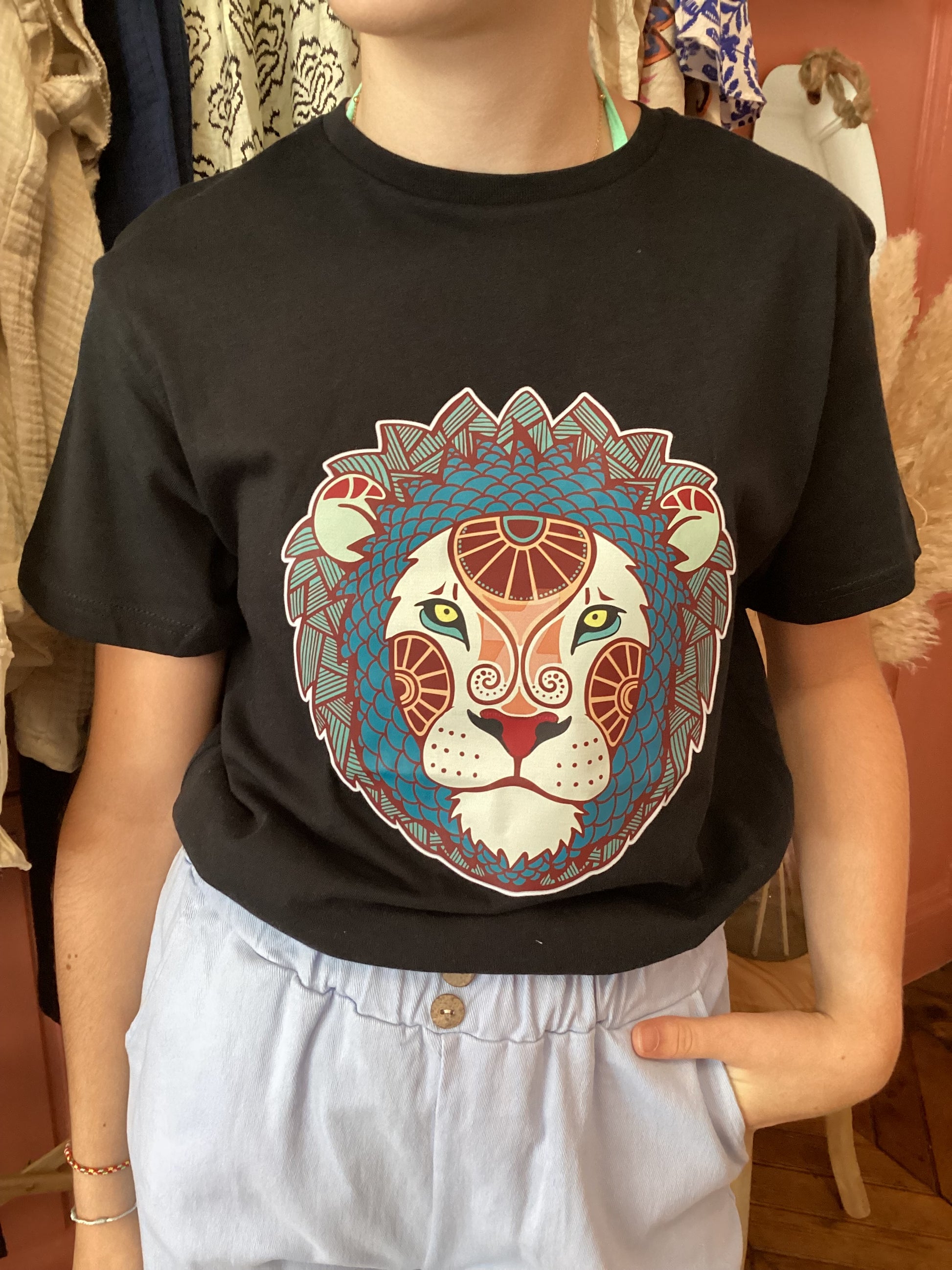 T-shirt noir fille avec lion mandala coloré